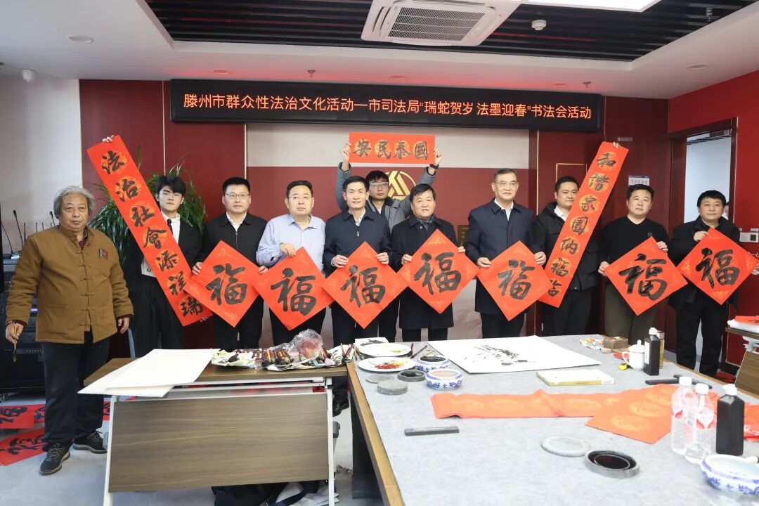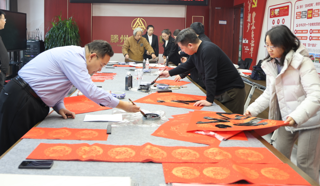 在新春佳节来临之际,滕州市司法局、市普法办公室、市政协书画院、市城市国有资产经营有限公司在滕州人力资源服务产业园开展“ 迎新春送祝福 ”书法会活动。把新春祝福送给产业园区,把法治理念送进职工们心中,活动将传统春联文化与普法工作紧密结合,送上了一道丰盛的新年法治文化大餐。