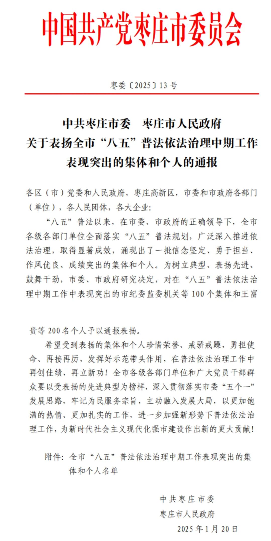 近日,中共枣庄市委、市政府发布通报,对在“八五”普法依法治理中期工作中表现突出的100个集体和200名个人予以通报表扬。其中,滕州市12个集体和25个个人受到通报表扬。