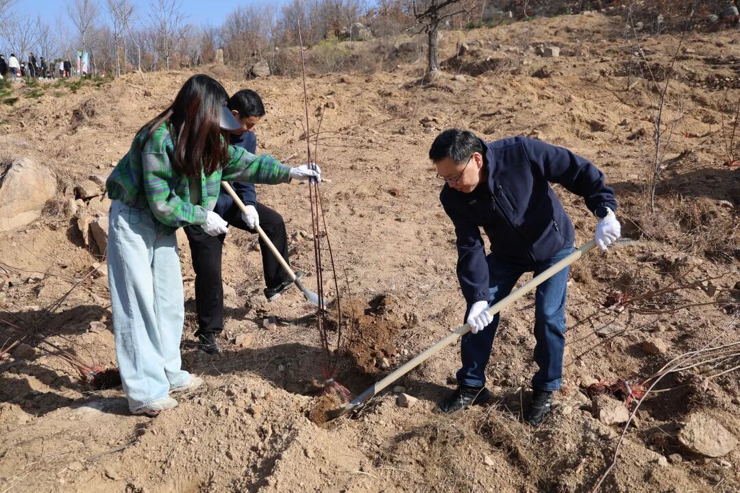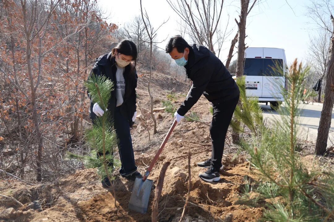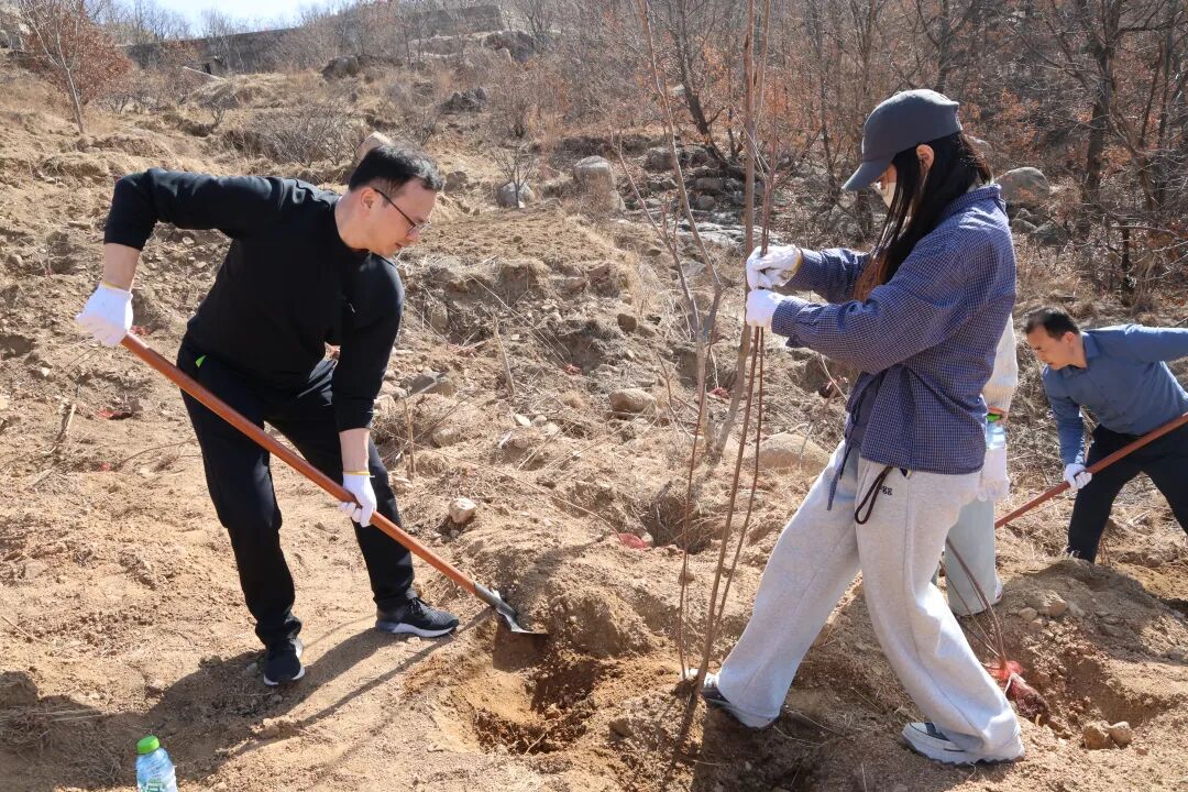 在植树现场,大家热情高涨,干劲十足,挥锹铲土、扶苗填坑,各个环节衔接有序,配合默契,呈现出一派热火朝天的劳动场景。经过一上午的辛勤劳动,100余株新栽种的树苗迎风挺立,为初春的大地增添了一抹新绿。