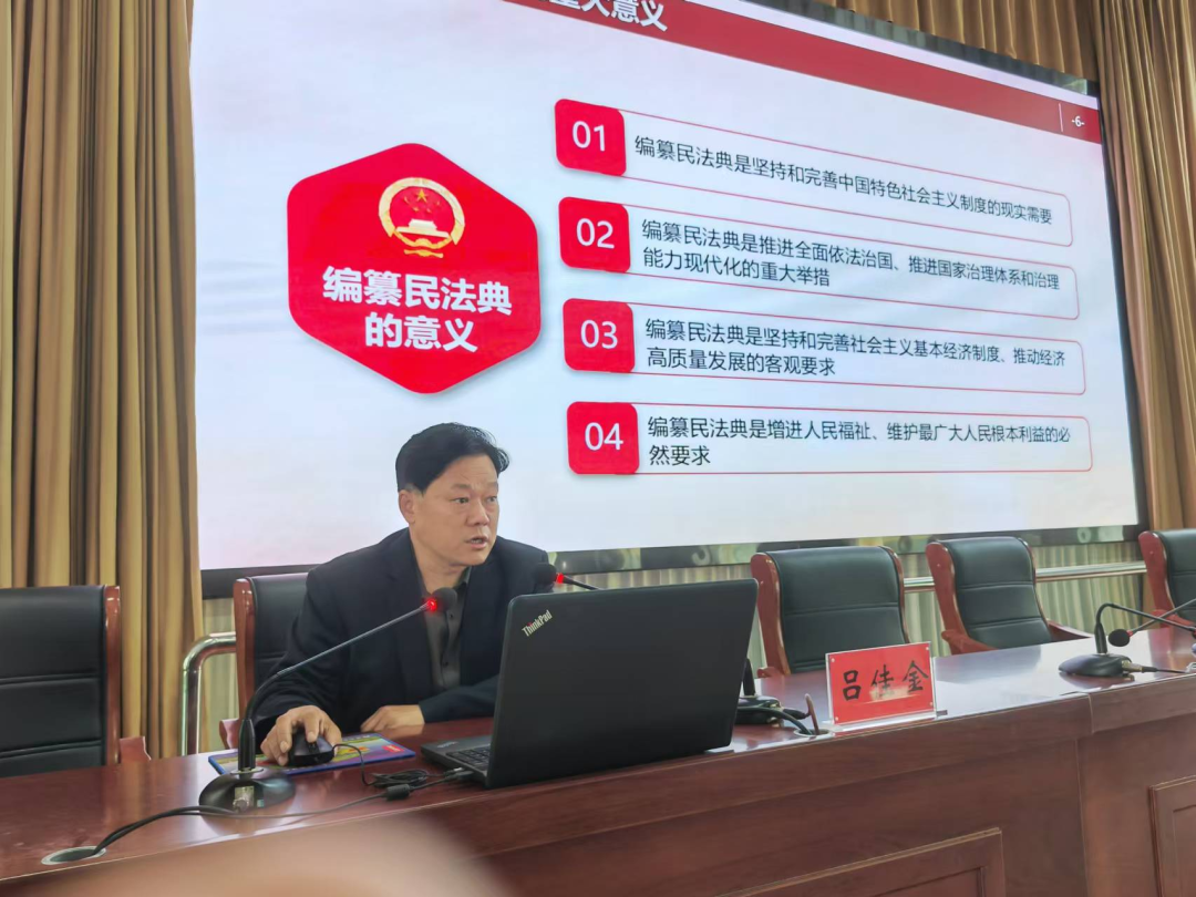 为进一步宣传好、学习好、用好民法典,强化机关干部运用法治思维履职尽责的意识和能力,5月12日,羊庄司法所邀请山东赞国律师事务所副主任、中国法学会会员、枣庄市《民法典》宣讲团成员吕佳金律师开展《民法典》专题讲座。镇领导及机关科室负责人、各总支书记、村居书记及“法律明白人”“法治带头人”、人民调解员约100余人参加。