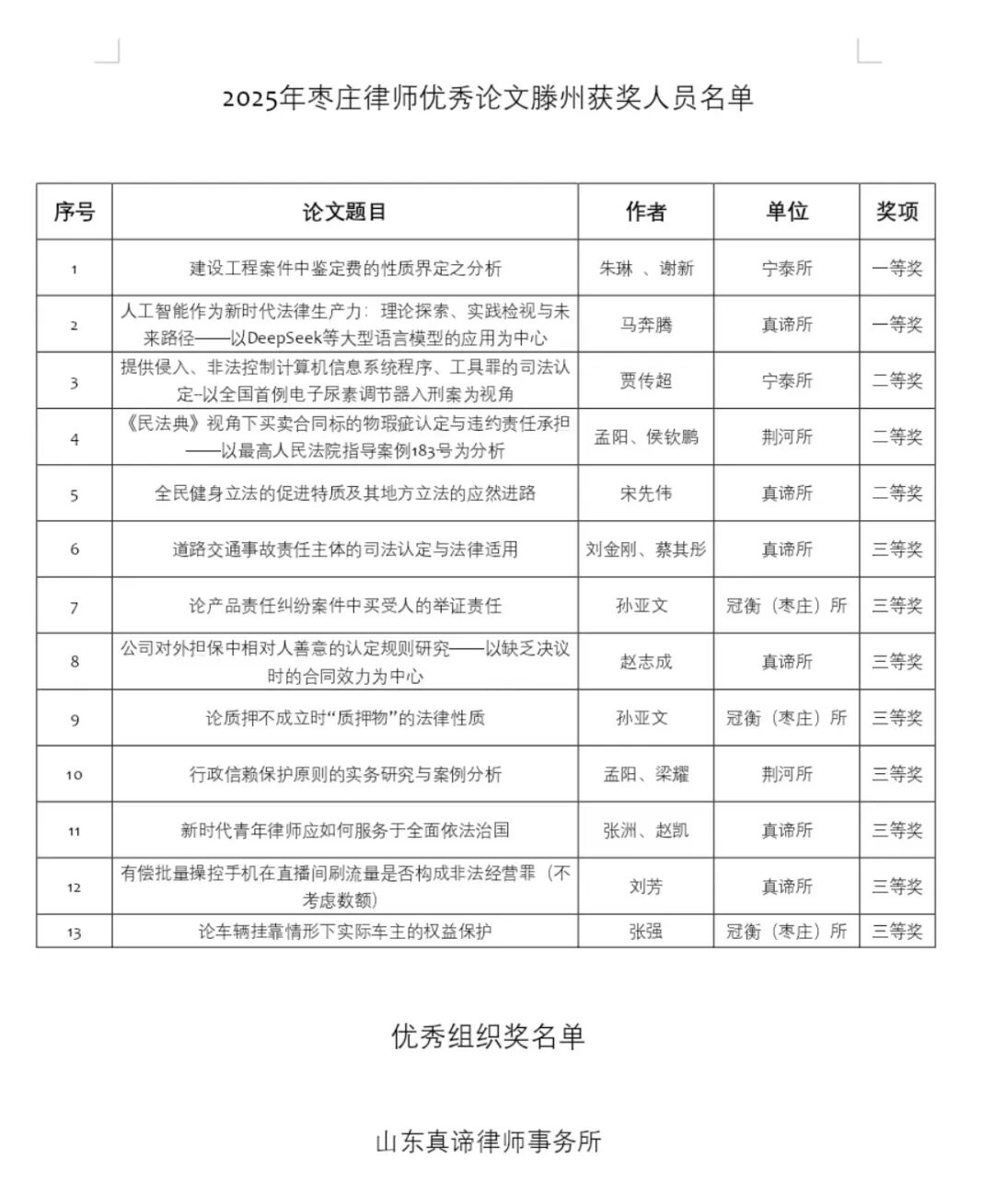 近日,在枣庄市律师协会组织开展了2025年度枣庄律师优秀论文评选活动中,滕州市律师行业喜获多项奖项,其中优秀论文一等奖2篇、二等奖3篇、三等奖8篇,优秀组织奖律所1家,为全市律师行业赢得了荣誉。