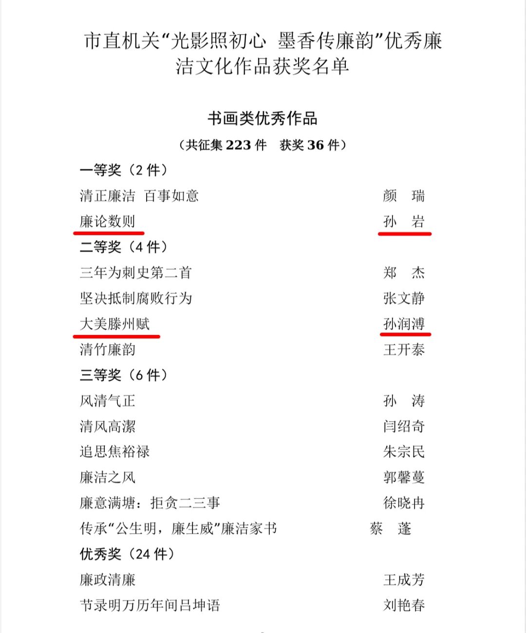 近日,市委市直机关工作委员会印发《关于表扬“光影照初心 墨香传廉韵”廉洁文化作品征集活动获奖单位及个人的通报》,对市直机关廉洁文化作品征集活动进行通报表扬,市司法局选送的三件书画类作品喜获一、二等奖和优秀奖,其中孙岩同志的《廉论数则》获一等奖,孙润溥同志的《大美滕州赋》获二等奖,于浩亮同志的《篆刻》获优秀奖,市司法局还荣获“优秀组织奖”,为全市司法行政系统赢得了荣誉。