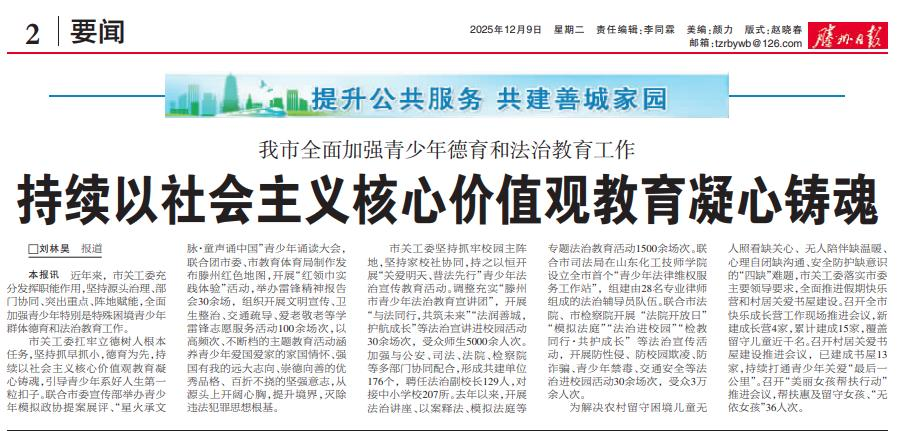 市关工委扛牢立德树人根本任务,坚持抓早抓小,德育为先,持续以社会主义核心价值观教育凝心铸魂,引导青少年系好人生第一粒扣子。联合市委宣传部举办青少年模拟政协提案展评、“星火承文脉·童声诵中国”青少年诵读大会,联合团市委、市教育体育局制作发布滕州红色地图,开展“红领巾实践体验”活动,举办雷锋精神报告会30余场,组织开展文明宣传、卫生整治、交通疏导、爱老敬老等学雷锋志愿服务活动100余场次,以高频次、不断档的主题教育活动涵养青少年爱国爱家的家国情怀、强国有我的远大志向、崇德向善的优秀品格、百折不挠的坚强意志,从源头上开阔心胸,提升境界,灭除违法犯罪思想根基。