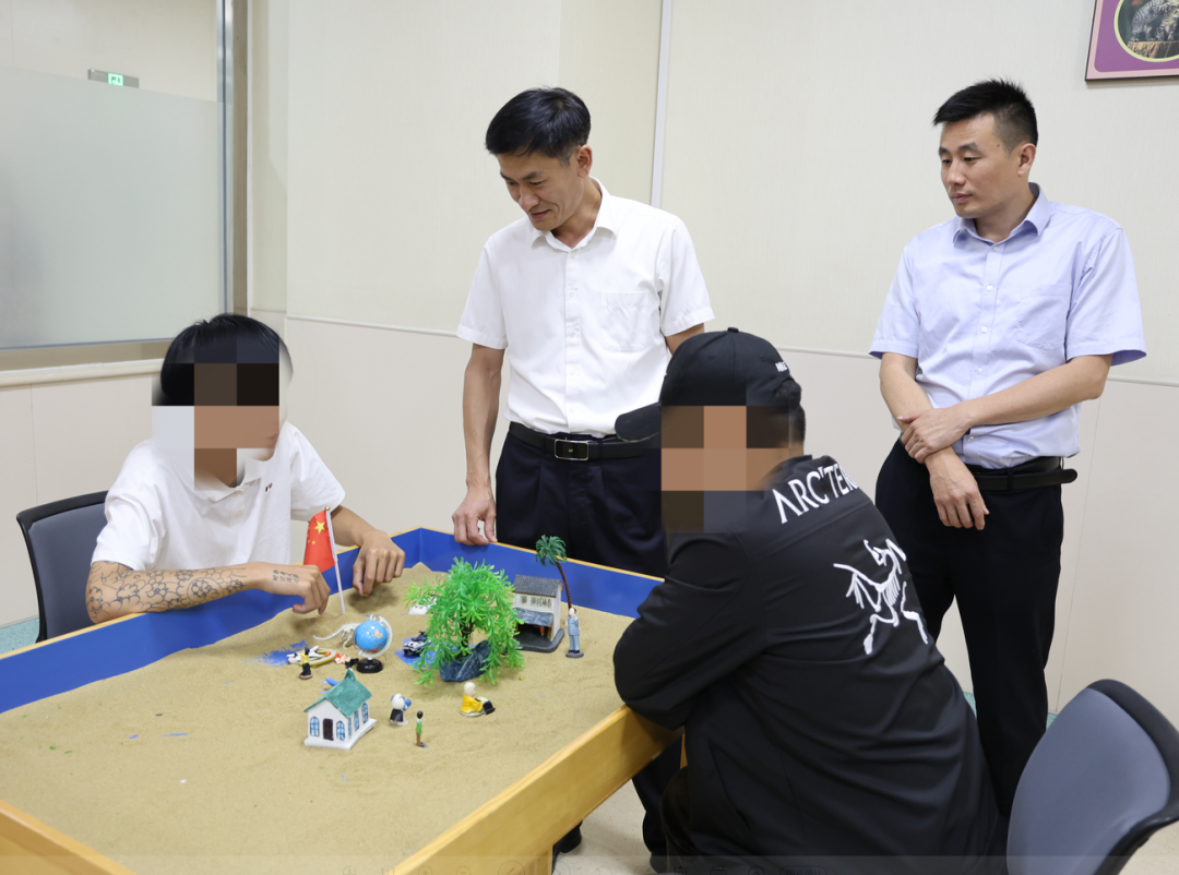 活动现场,心理治疗师宋常宽老师依据前期的心理测评结果,组织开展了主题为“在‘关系沙盘’中看见自己”的人际关系团体心理辅导。沙盘游戏突破传统语言沟通的限制,运用非言语心理治疗技术,以沉浸式的沙盘场景构建为媒介,引导未成年社区矫正对象通过沙具选择、场景布局等具象化表达,精准捕捉其认知偏差和情绪障碍,动态评估其心理状态,为后续实施个性化教育帮扶工作提供科学依据。