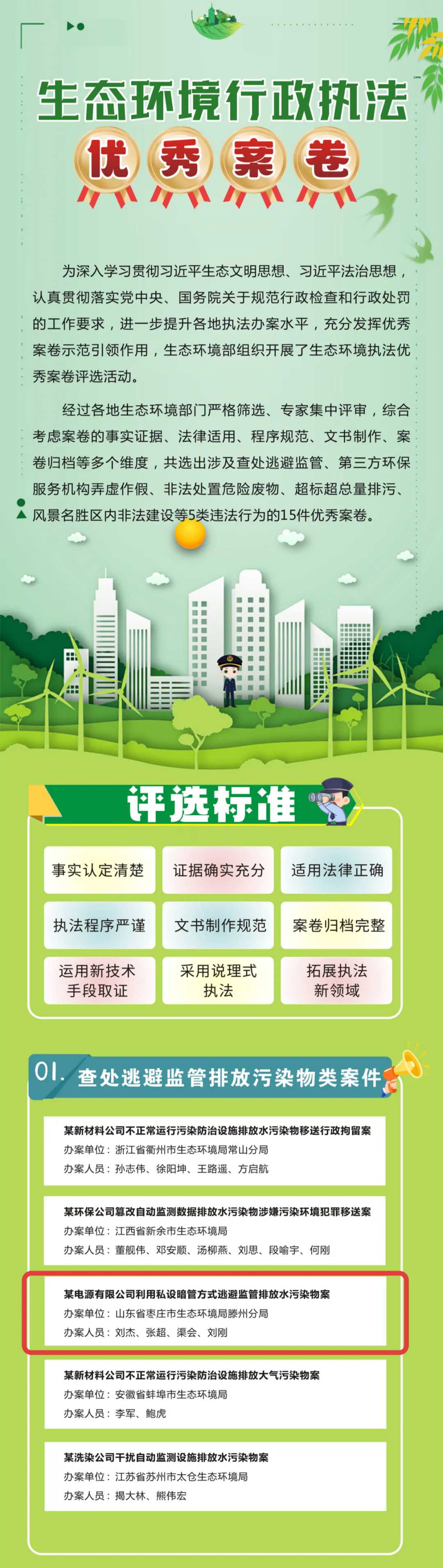 10月30日,我市生态环境执法工作再传捷报!市生态环境局滕州分局主办的“某电源有限公司利用私设暗管方式排放水污染物案”,从全国众多案件中脱颖而出,被生态环境部评为全国生态环境行政执法15件“优秀案卷”之一,为我省唯一入选案卷。这也是继2022年我市案卷荣获省司法厅“全省十佳行政执法优秀案卷”(第二名)后的又一殊荣,标志着我市生态环境执法水平迈上新台阶!