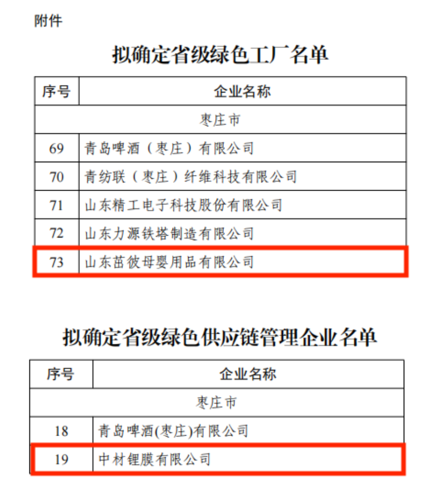 近日,省工信厅公示了2024年度省级绿色制造单位名单,山东茁彼母婴用品有限公司入选省级绿色工厂名单,中材锂膜有限公司入选绿色供应链管理企业名单。
