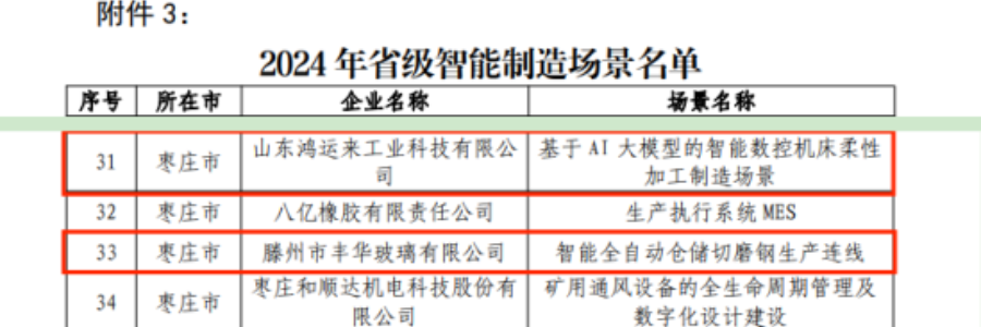 近日,省工信厅公示了2024年山东省智能工厂、数字化车间、智能制造场景等项目拟认定企业名单,开发区山东有荣机床有限公司入选2024年山东省数字化车间,山东鸿运来工业科技有限公司、滕州市丰华玻璃有限公司入选2024年山东省智能制造场景。