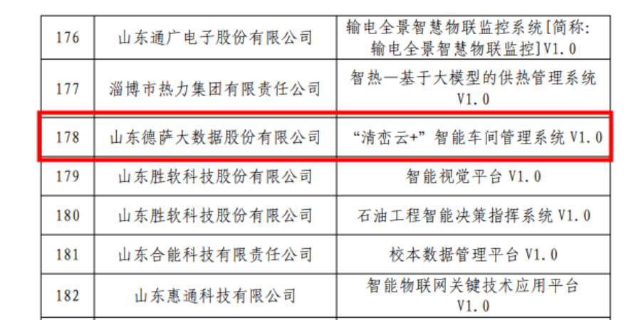 9月12日,省工业和信息化厅公布了第八批山东省首版次高端软件产品公示名单,开发区山东德萨大数据股份有限公司“清峦云+”智能车间管理系统V1.0成功入选。