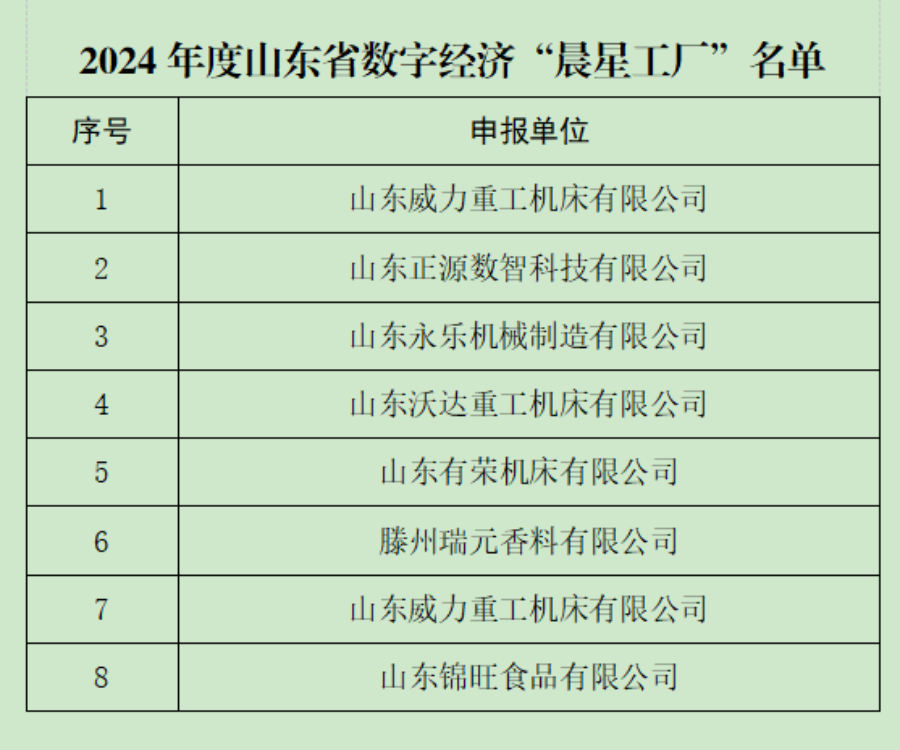 近日,山东省工业和信息化厅公布了2024年度数字经济“晨星工厂”名单,山东威力重工机床有限公司、山东正源数智科技有限公司等8家申报企业全部入选。
