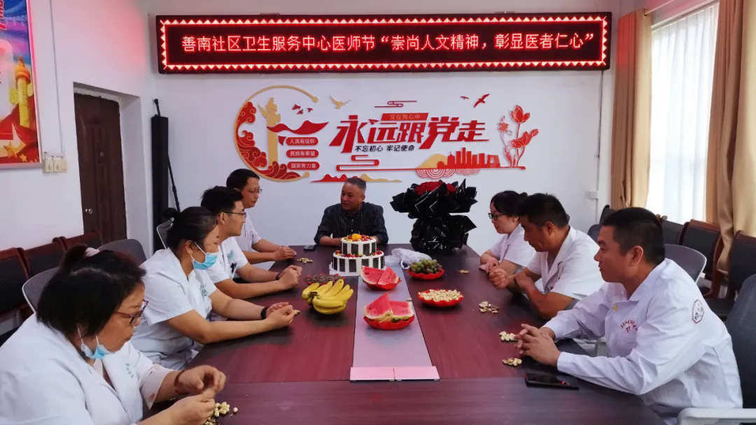8月19日上午,滕州市荆河社区卫生服务中心举行第七个中国医师节庆祝活动,为全体医务人员送上精心准备的节日蛋糕及鲜花,向全体医务工作者致以节日的祝贺和诚挚的问候。(韩超)