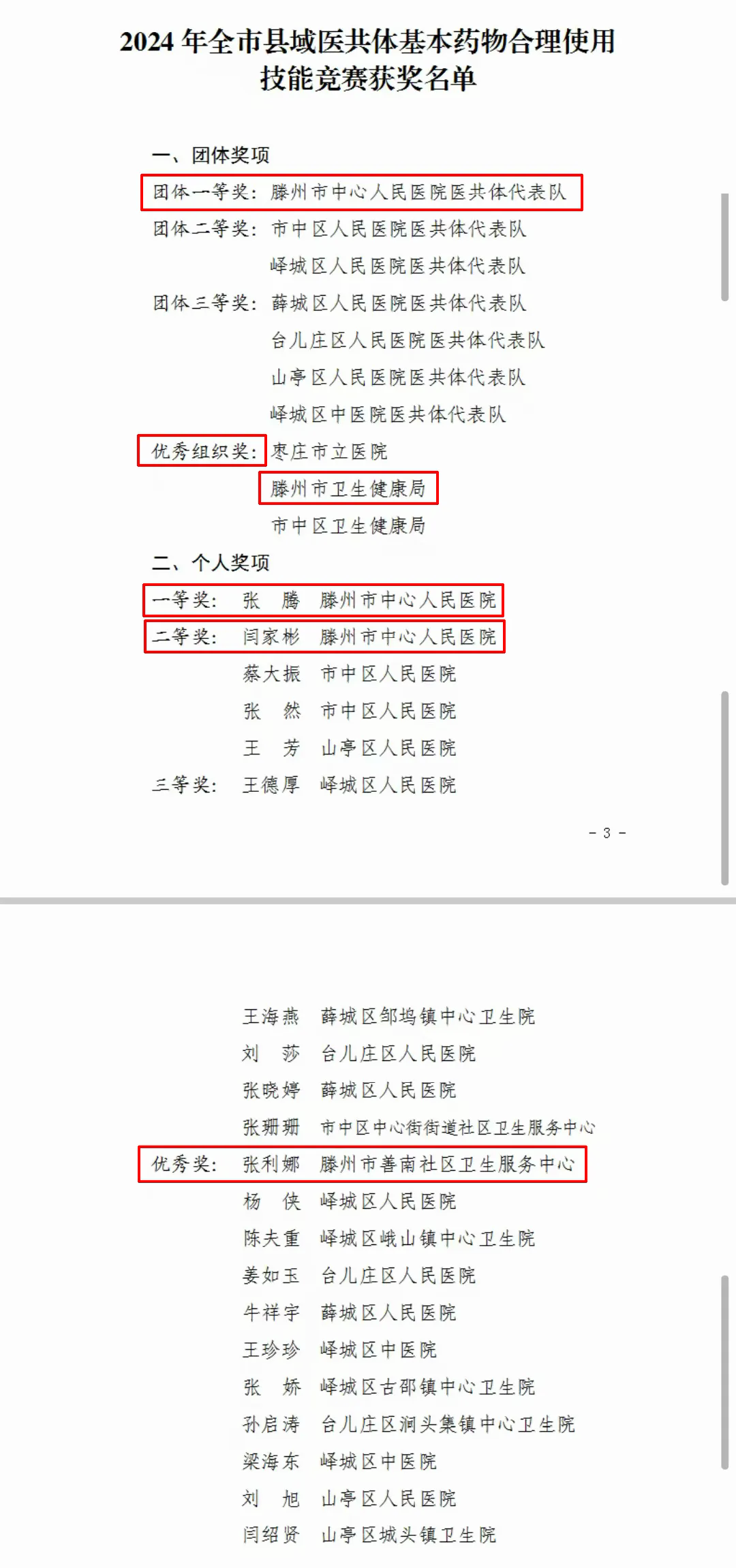 10月11日,由枣庄市卫生健康委员会、枣庄市总工会主办,枣庄市立医院承办的枣庄市县域医共体基本药物合理使用技能竞赛成功举办,滕州市卫生健康局选拔推荐的滕州市中心人民医院药师张腾、闫家彬和滕州市善南社区卫生服务中心张利娜在决赛中分别取得一等奖、二等奖和优秀奖的佳绩,其所在滕州代表队获得团体一等奖,将代表枣庄市参加省级竞赛。