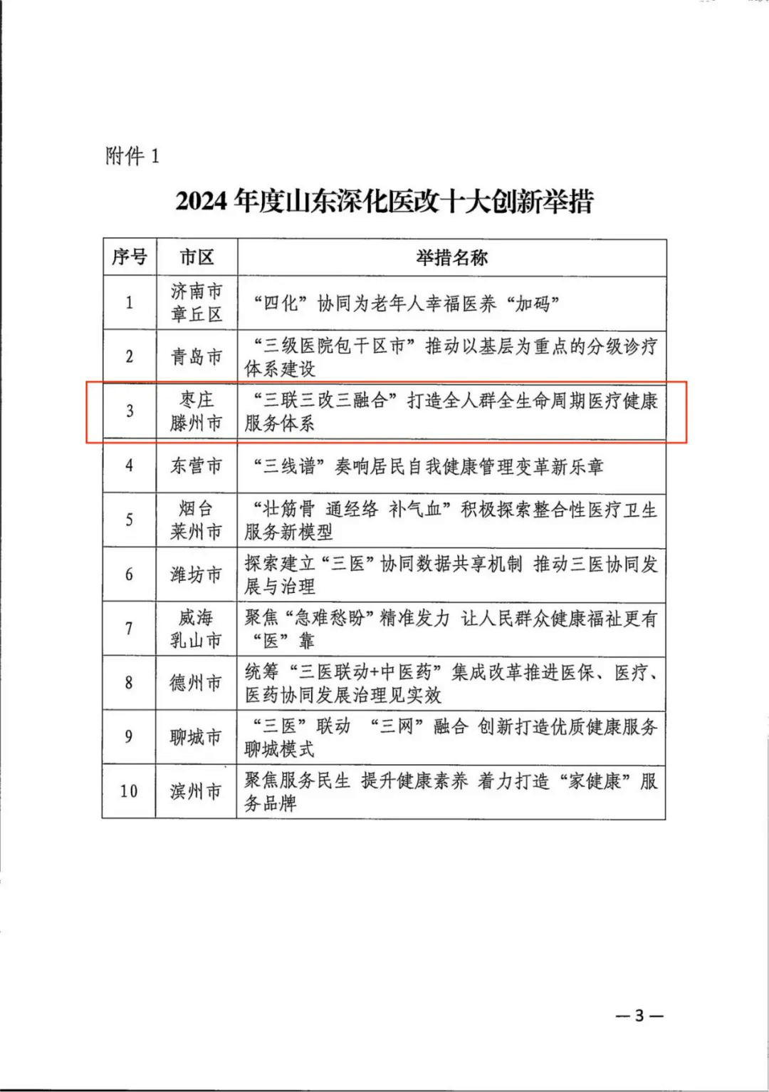 近日,山东省2024年度“创新引领 医改惠民”山东深化医改十大创新举措、公立医院高质量发展十大创新举措推介活动结果揭晓。经过全省征集、市级审荐、专家评议等程序,共有20项创新举措入选,其中滕州市《“三联三改三融合”打造全人群全生命周期医疗健康服务体系》入选深化医改十大创新举措,为全省乃至全国医改实践提供了可复制的县域经验。这也是我市相关医改做法连续两年入选省级年度深化医改创新举措。