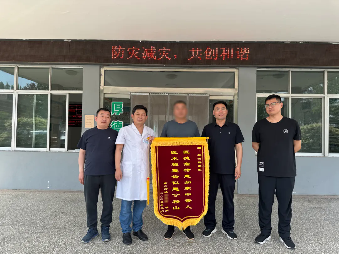 5月12日,家住南沙河镇的刘先生专程来到滕州市木石镇卫生院,将一面写有"医德高待患如家中亲人 医术强整齿似愚公移山"的锦旗送到口腔科杨洪磊医师手中。
