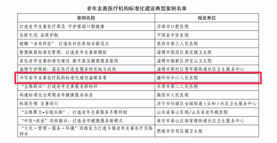 此次入选的案例涵盖老年医学科、老年友善医疗机构、安宁疗护病区、康复医院四大类别。其中,滕州市中心人民医院以“书写老年友善医疗机构标准化建设温暖答卷”案例入选老年友善医疗机构标准化建设典型案例,通过优化就医环境、简化就医流程、强化人文关怀,打造老年友善医疗服务典范。