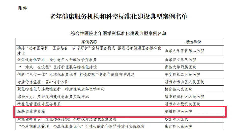 近日,山东省卫生健康委员会公布老年健康服务机构和科室标准化建设典型案例名单,滕州市3家医疗机构的4个实践案例成功入选,彰显了滕州市在老年健康服务标准化、规范化建设中的突出成效,为区域老年健康服务高质量发展树立了标杆。