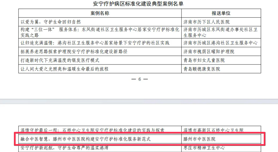 滕州市中医医院凭借“深耕杏林护桑榆”案例入选医院老年医学科标准化建设典型案例,医院聚焦老年健康需求,以标准化建设为抓手,构建起覆盖诊疗、护理、康复的全链条服务体系;其“融合中医智慧,构建安宁疗护标准化服务新范式”案例同时入选安宁疗护病区标准化建设典型案例,将中医特色与安宁疗护深度融合,为生命终末期患者提供有温度、有尊严的医疗服务。