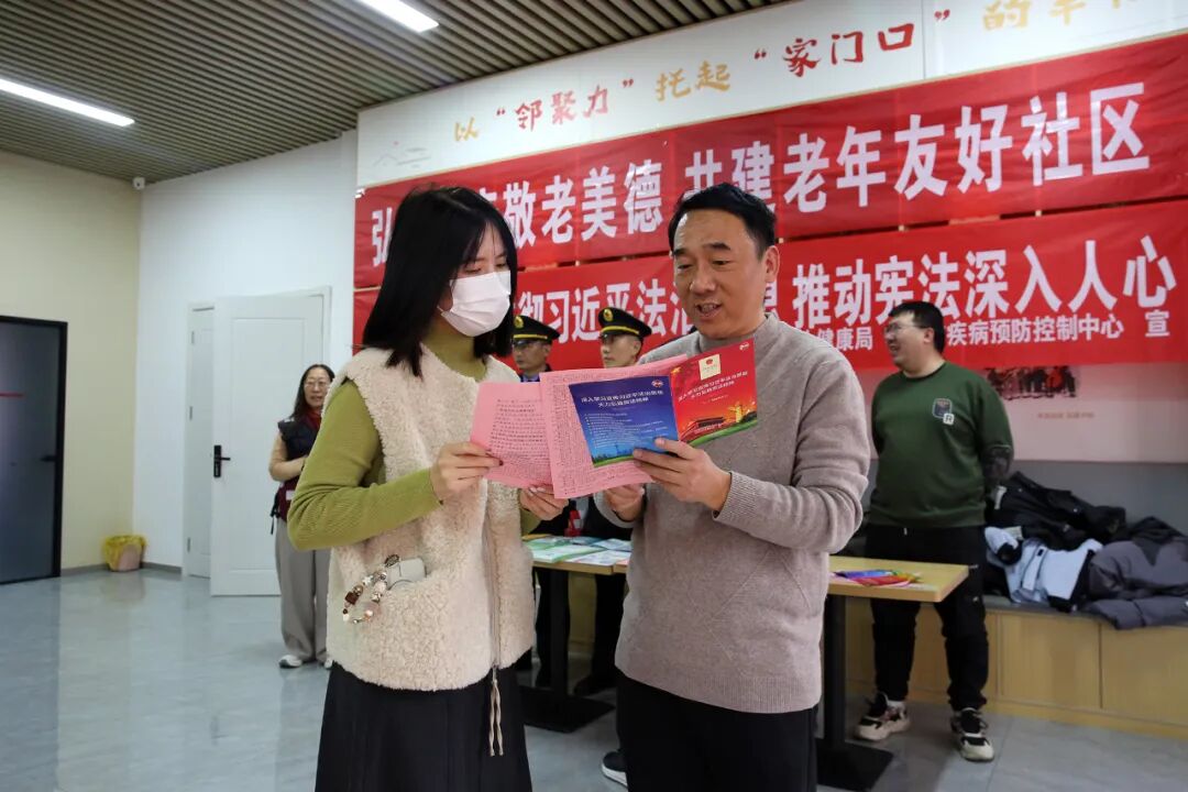 本次活动紧扣“学习宣传贯彻习近平法治思想 推动宪法深入人心”主题,创新采用“宪法宣传+健康义诊”双融合服务模式,在现场精心设置咨询服务台,悬挂主题横幅,法治宣传人员发放《中华人民共和国宪法》《中华人民共和国法治宣传教育法》和卫生健康领域相关法律法规折叠页等宣传资料,用通俗易懂的“家常话”解读宪法核心要义、公民基本权利义务等关键内容。医护团队同步开展义诊服务,为群众测量提供常见病诊疗、健康指导服务,结合健康咨询讲解宪法赋予公民的健康权益和卫生健康法律法规,将“普法宣传”与“健康服务”有机结合,为群众送上零距离的“法治+健康”双重保障,推动宪法精神走进千家万户。