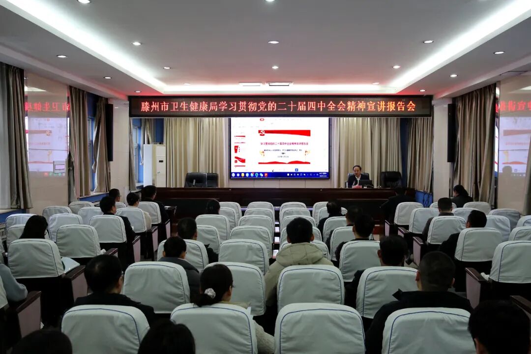 12月22日,滕州市卫生健康局举办学习贯彻党的二十届四中全会精神宣讲报告会。学习贯彻党的二十届四中全会精神市委宣讲团成员,市中心人民医院院长,市卫生健康局党组书记、局长,市中医药管理局局长范警华作宣讲报告。市卫生健康局领导班子成员、局机关全体党员干部参加宣讲会。
