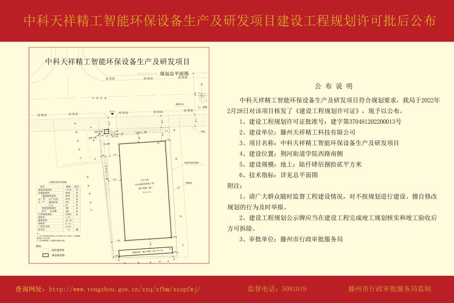 中科天祥精工智能环保设备生产及研发项目建设工程规划许可批后公布