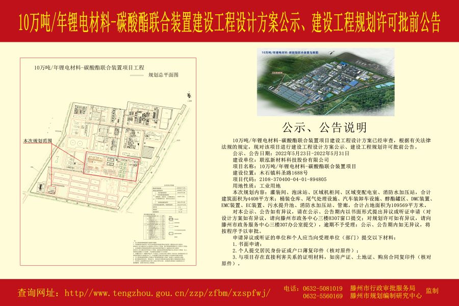 联泓新材料科技股份有限公司10万吨年锂电材料-碳酸酯联合装置项目建设工程设计方案公示、建设工程规划许可批前公告