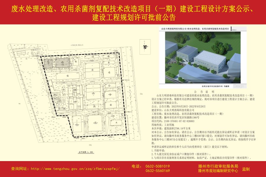 山东大明消毒科技有限公司废水处理改造、农用杀菌剂复配技术改造项目(一期)建设工程设计方案公示、建设工程规划许可批前公告