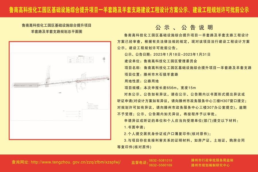 鲁南高科技化工园区基础设施综合提升项目—羊套路及羊套支路建设工程设计方案公示、建设工程规划许可批前公告
