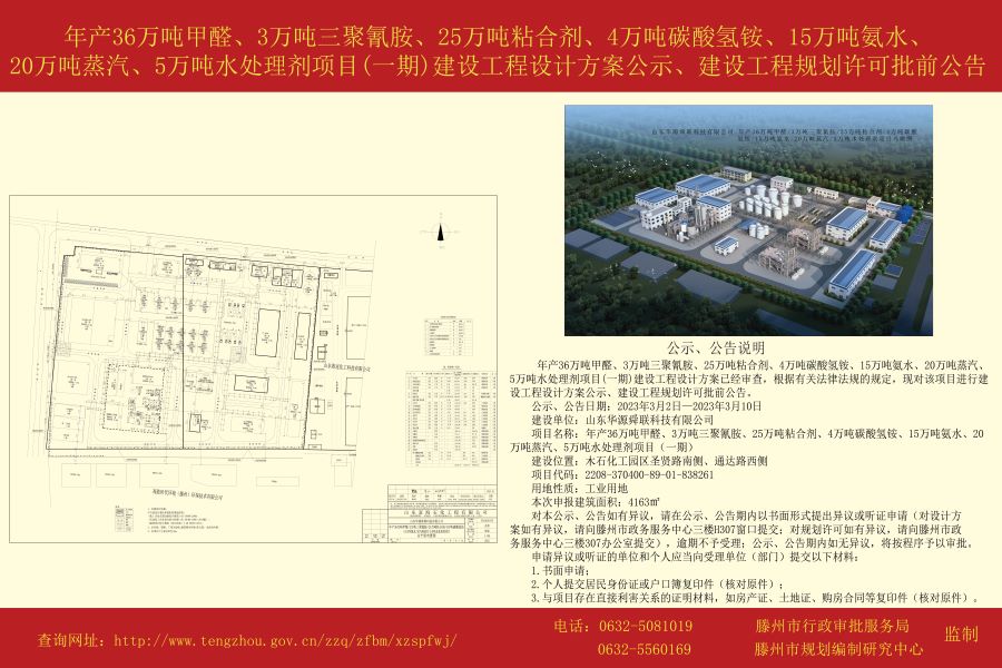年产36万吨甲醛、3万吨三聚氰胺、25万吨粘合剂、4万吨碳酸氢铵、15万吨氨水、20万吨蒸汽、5万吨水处理剂项目(一期)建设工程设计方案公示、建设工程规划许可批前公告.jpg