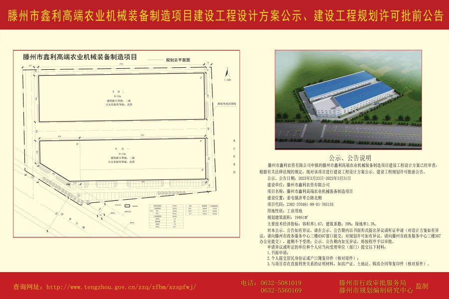 滕州市鑫利高端农业机械装备制造项目建设工程设计方案公示、建设工程规划许可批前公告