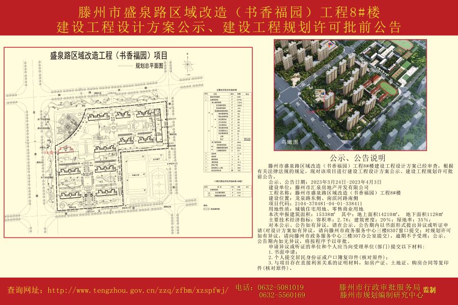滕州市盛泉路区域改造(书香福园)8#楼建设工程设计方案公示、建设工程规划许可批前公告