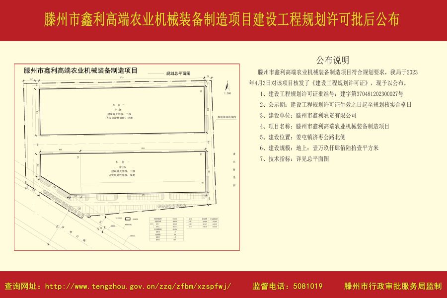 滕州市鑫利高端农业机械装备制造项目建设工程规划许可批后公布