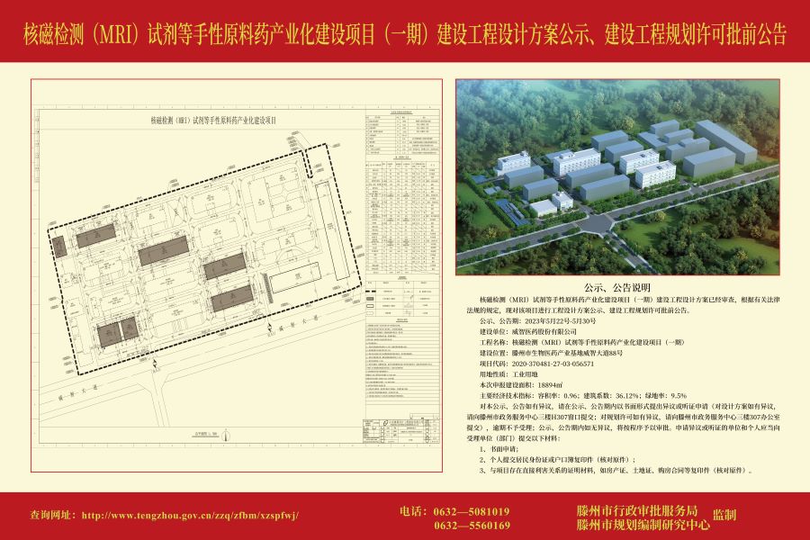 核磁检测(MRI)试剂等手性原料药产业化建设项目(一期)建设工程设计方案公示、建设工程规划许可批前公告