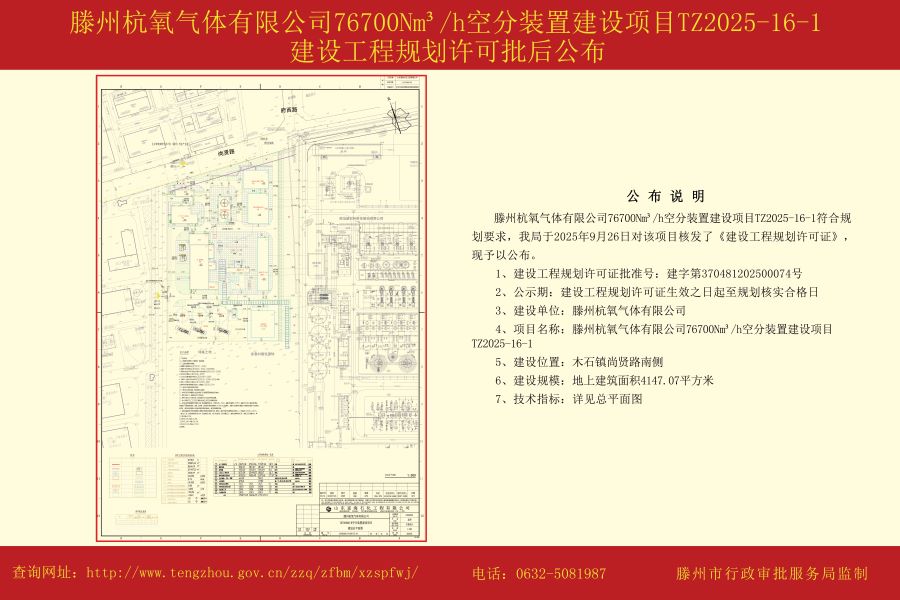 滕州杭氧气体有限公司76700Nm³h空分装置建设项目TZ2025-16-1建设工程规划许可批后公布