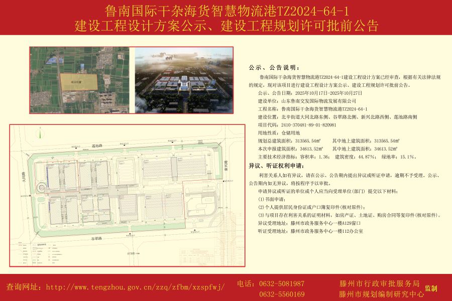 鲁南国际干杂海货智慧物流港TZ2024-64-1建设工程设计方案公示、建设工程规划许可批前公告