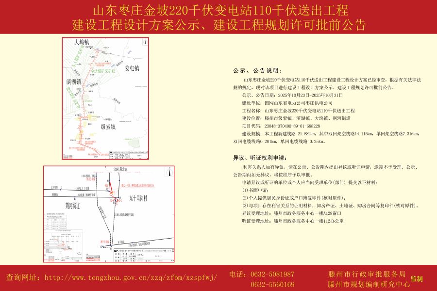 山东枣庄金坡220千伏变电站110千伏送出工程建设工程设计方案公示、建设工程规划许可批前公告