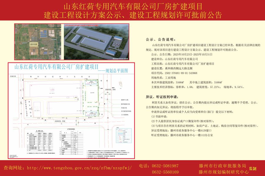 山东红荷专用汽车有限公司厂房扩建项目建设工程设计方案公示、建设工程规划许可批前公告