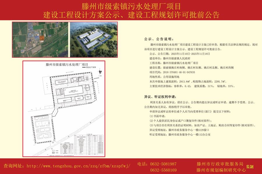 滕州市级索镇污水处理厂项目建设工程设计方案公示、建设工程规划许可批前公告