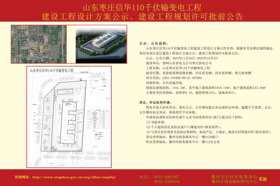 山东枣庄信华110千伏输变电工程建设工程设计方案公示、建设工程规划许可批前公告