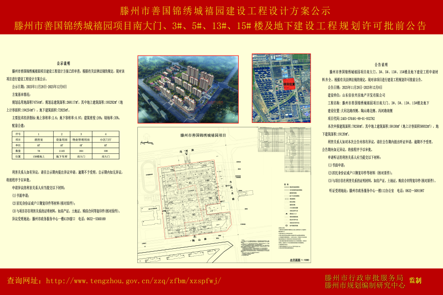滕州市善国锦绣城禧园建设工程设计方案公示、滕州市善国锦绣城禧园项目南大门、3#、5#、13#、15#楼及地下建设工程规划许可批前公告