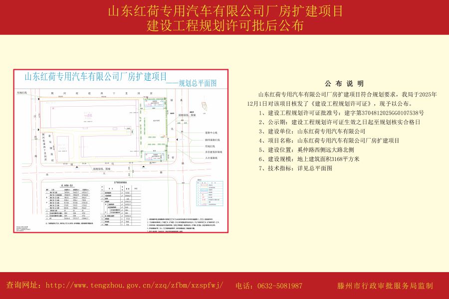山东红荷专用汽车有限公司厂房扩建项目建设工程规划许可批后公布