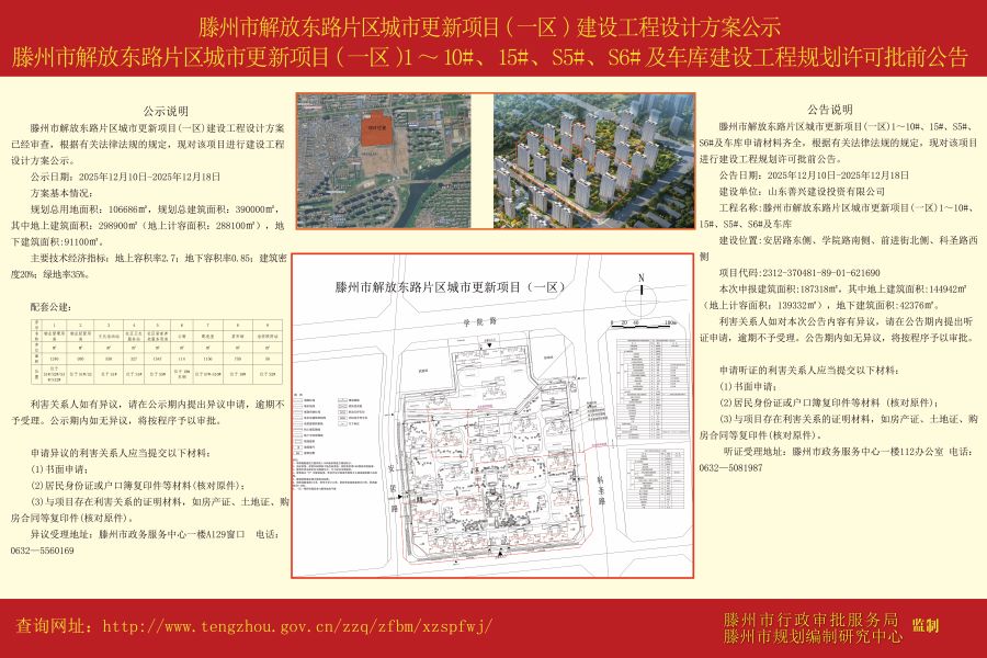 滕州市解放东路片区城市更新项目(一区)建设工程设计方案公示、滕州市解放东路片区城市更新项目(一区)1~10#、15#、S5#、S6#及车库建设工程规划许可批前公告.jpg