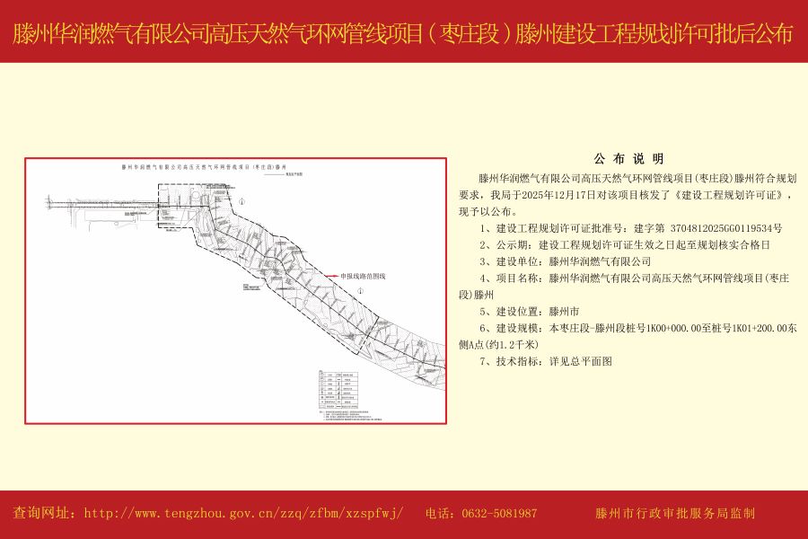 滕州华润燃气有限公司高压天然气环网管线项目(枣庄段)滕州建设工程规划许可批后公布