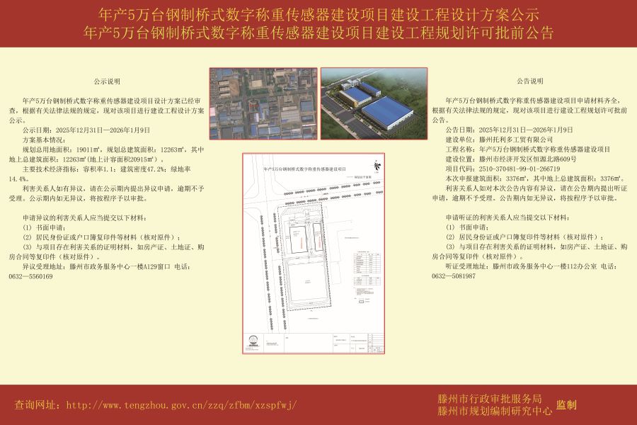 年产5万台钢制桥式数字称重传感器建设项目建设工程设计方案公示、年产5万台钢制桥式数字称重传感器建设项目建设工程规划许可批前公告