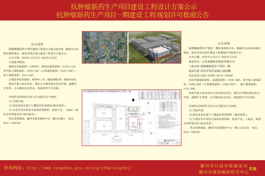 抗肿瘤新药生产项目建设工程设计方案公示、抗肿瘤新药生产项目一期建设工程规划许可批前公告.jpg