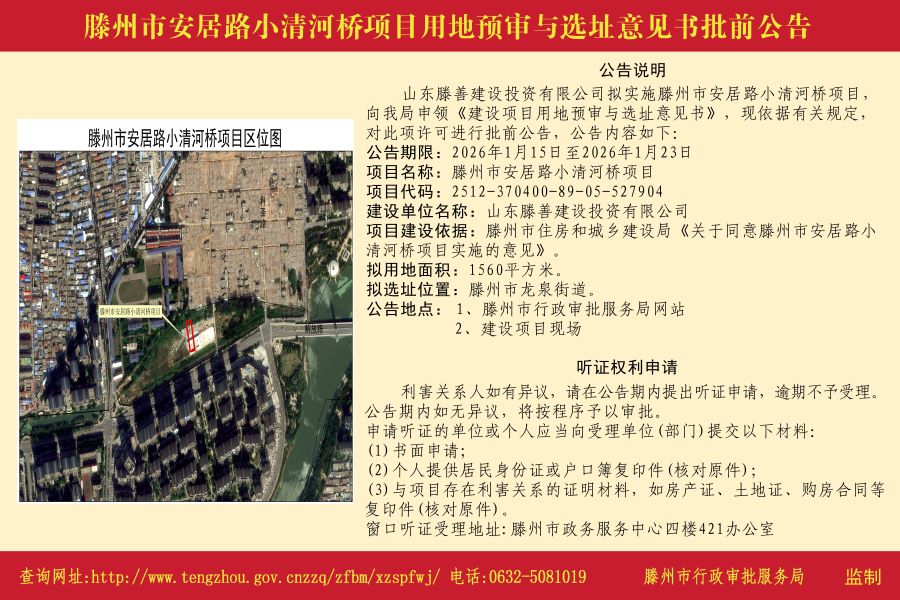 滕州市安居路小清河桥项目用地预审与选址意见书批前公告