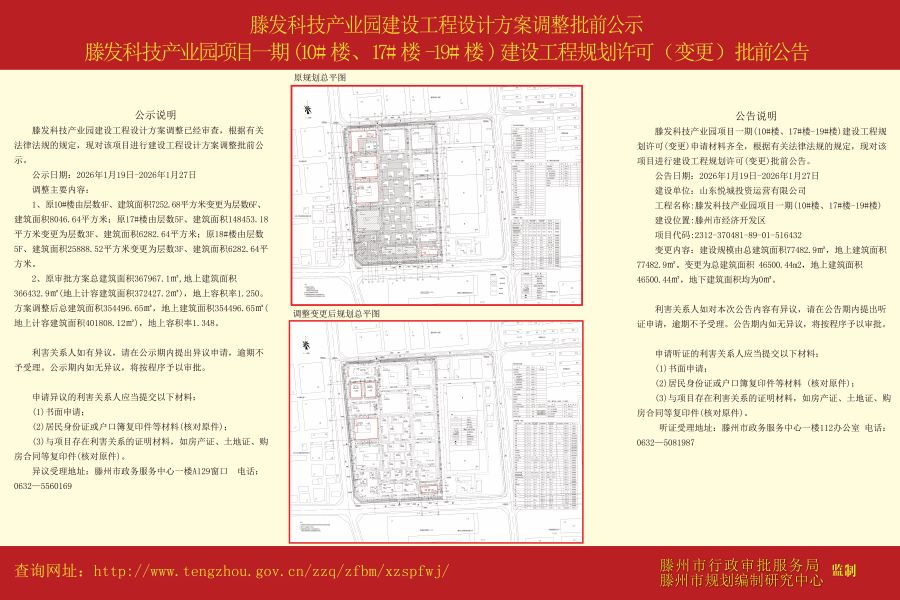 滕发科技产业园建设工程规划设计方案调整批前公示、滕发科技产业园项目一期(10#楼、17#楼-19#楼)建设工程规划许可(变更)批前公告