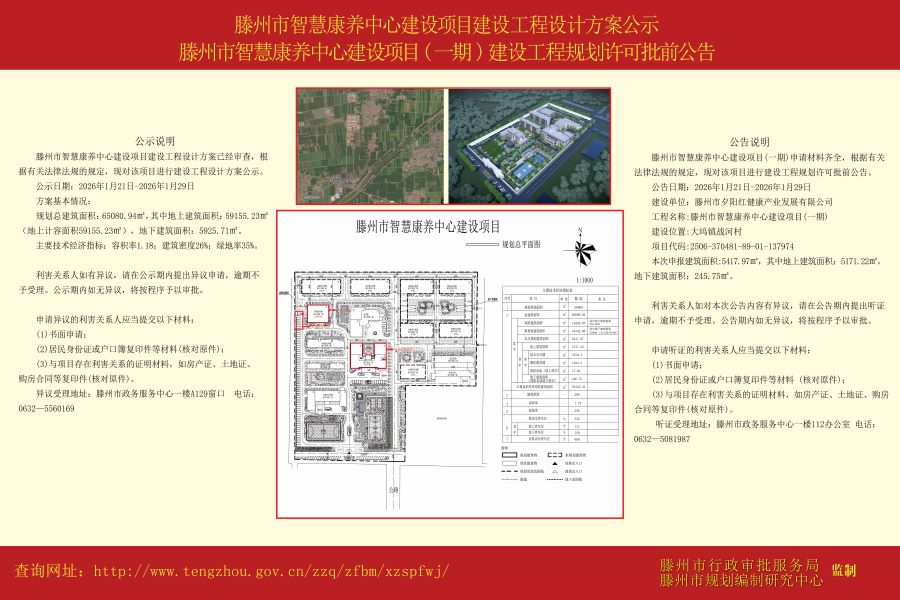 滕州市智慧康养中心建设项目建设工程设计方案公示、滕州市智慧康养中心建设项目(一期)建设工程规划许可批前公告