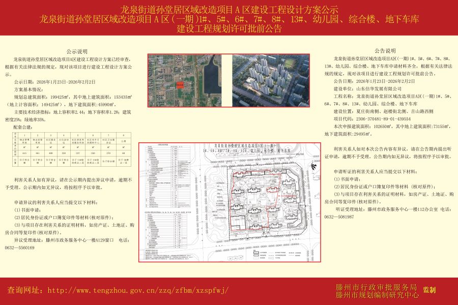 龙泉街道孙堂居区域改造项目A区建设工程设计方案公示、龙泉街道孙堂居区域改造项目A区(一期)1#、5#、6#、7#、8#、13#、幼儿园、综合楼、地下车库建设工程规划许可批前公告.jpg