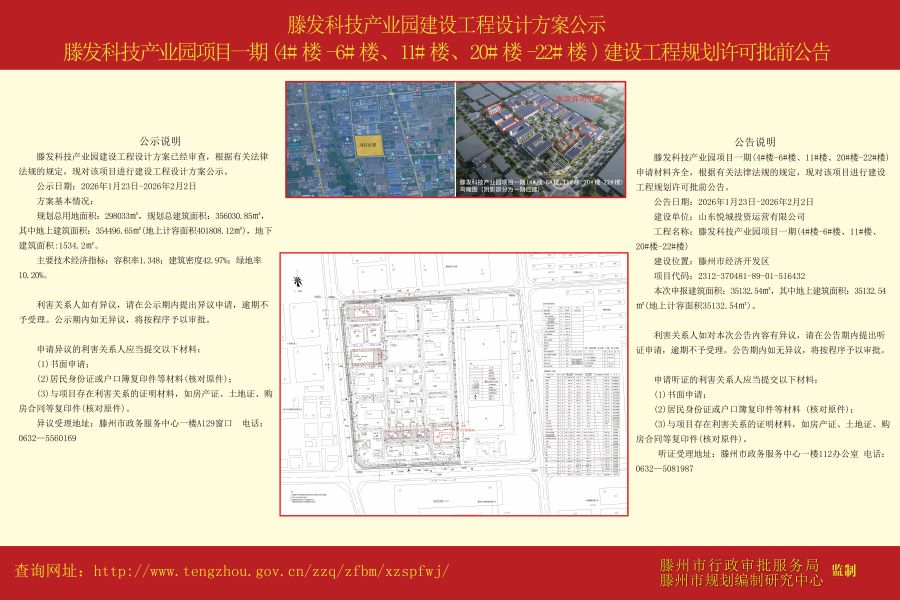 滕发科技产业园建设工程设计方案公示、滕发科技产业园项目一期(4#楼-6#楼、11#楼、20#楼-22#楼)建设工程规划许可批前公告
