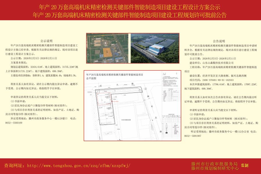 年产20万套高端机床精密检测关键部件智能制造项目建设工程设计方案公示、年产20万套高端机床精密检测关键部件智能制造项目建设工程规划许可批前公告