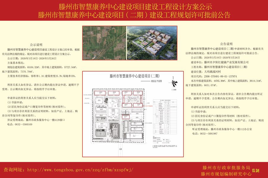 滕州市智慧康养中心建设项目建设工程设计方案公示、滕州市智慧康养中心建设项目(二期)建设工程规划许可批前公告